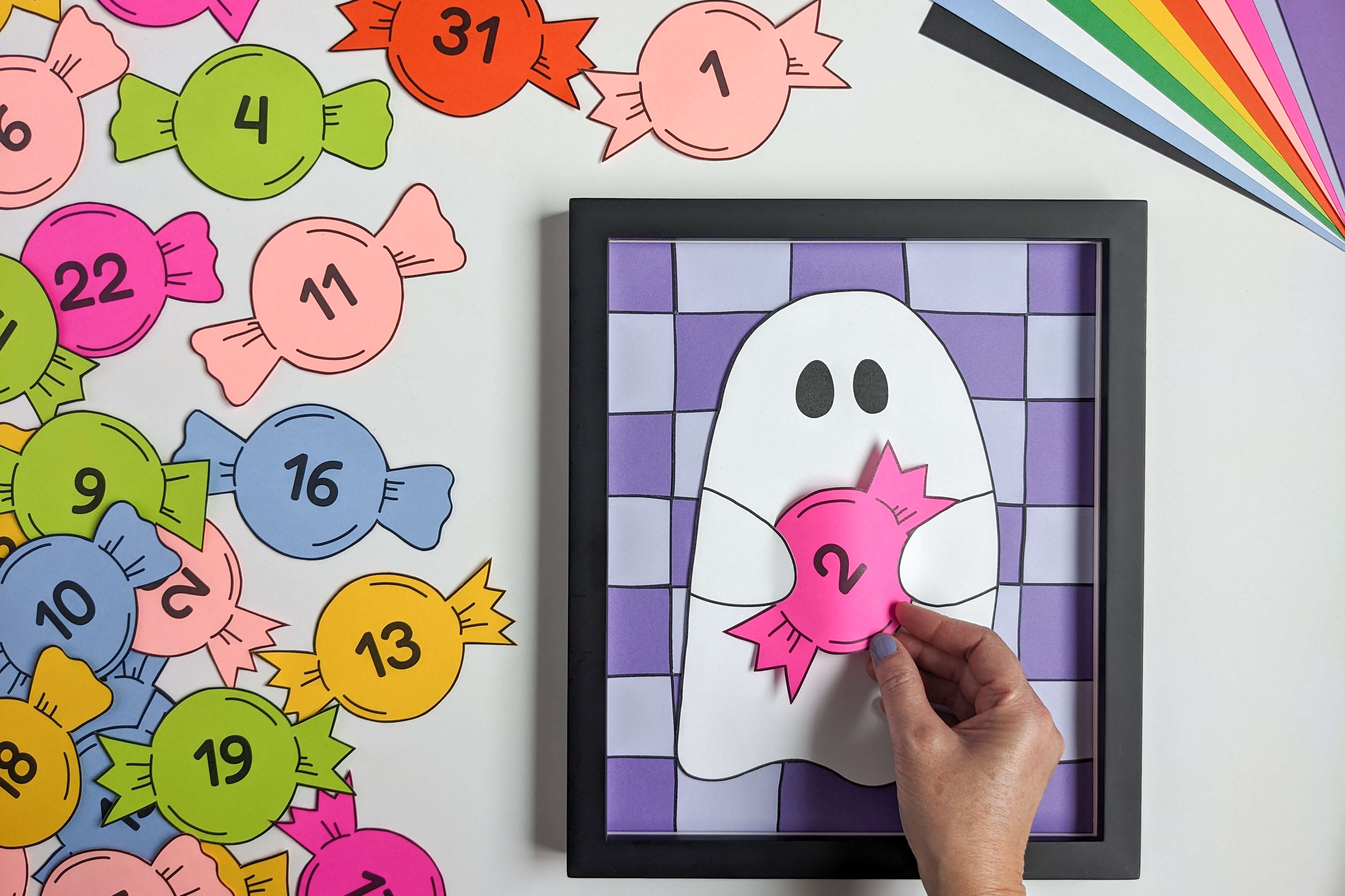 My cute ghost holds colorful paper candy numbered with each October day that’s standing between kids and a big bucket of candy. Each day, kids can swap out a new candy piece from the 1st to 31st.