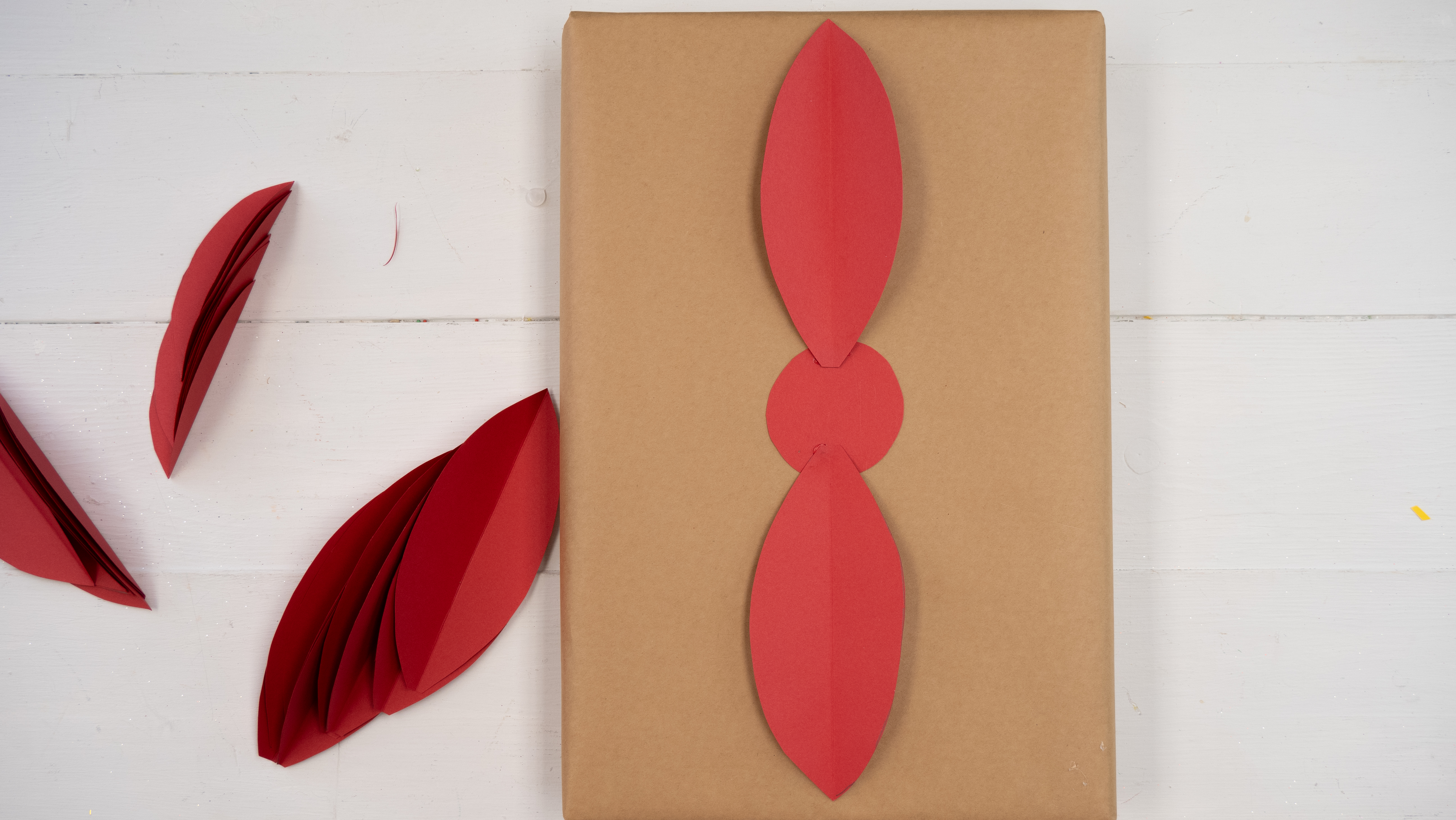 18. Cut leaves out of the green paper and glue to the present under the flower.